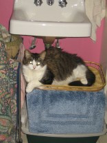Katie had started spending time here awhile ago – I am not sure what it's about – although she can look out into the kitchen (the bathroom opens off the kitchen) so it must be a good vantage point for her. She is a sweet quiet cat who keeps to herself – she does NOT like to be picked up and rarely lets me pet her – although she loves to eat cooked chicken or tuna etc from my hands.